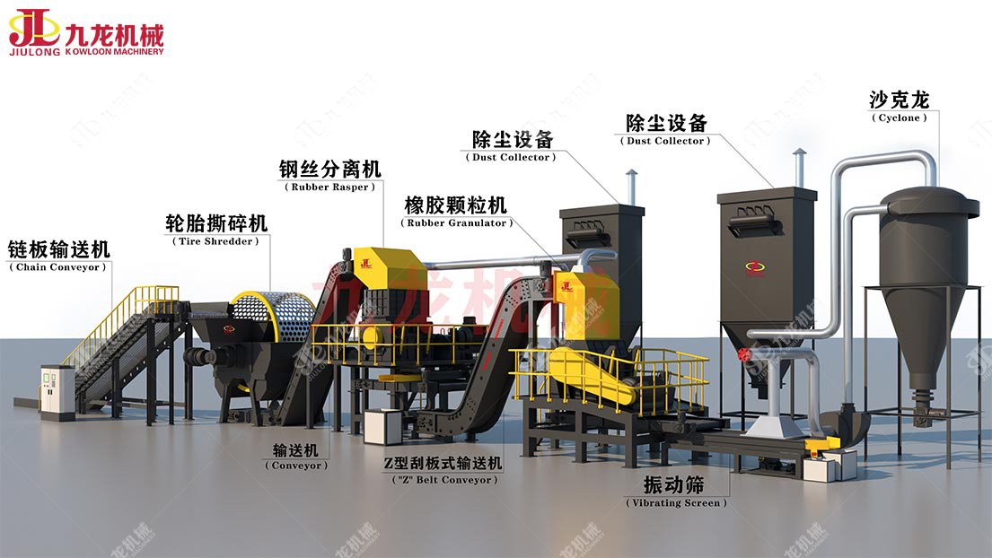 在工作原理上輪胎輪胎撕碎機采用低速高扭矩轉(zhuǎn)動的,主軸電機直連設(shè)計通過刀片卡角作用,將整個廢舊輪胎進行破碎加工,經(jīng)過雙軸撕裂加工后的廢舊輪胎塊,在滾篩的作用下實現(xiàn)在整個破碎過程中,小于或者等于50*50的物料從輪胎撕碎機圓網(wǎng)篩中漏出,進入后續(xù)工序。大于50*50的物料經(jīng)圓網(wǎng)篩返回到輪胎撕碎機的破碎室進行循環(huán)破碎,直至膠塊大小符合要求后排出輪胎撕碎機。